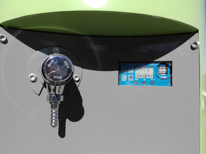 La temperatura del agua es generada por un termotanque solar, respaldado por una resistencia eléctrica que mantiene constante la temperatura del agua. La energía para cargar celulares es generada por dos pantallas fotovoltáicas que cargan una batería de 12v de ciclo profundo.