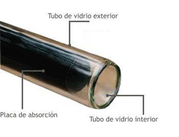 Los colectores de tubos de vidrio al vacío están hechos de dos tubos en líneas paralelas. Cada uno consiste en un tubo exterior y uno interior o tubo de absorción; este está cubierto con una capa especial que absorbe la energía solar e inhibe la perdida de calor radiante. El aire es evacuado (extraído) del espacio entre los dos tubos para formar el vacío, el cual elimina la perdida de calor conectivo y conductivo, y calienta el agua que fluye dentro de él. Estos tubos de alta tecnología absorben no solamente los rayos solares directos (radiación solar directa), sino también el calor del medio ambiente y cuando está nublado (radiación solar difusa). El tubo exterior está hecho de borocilicato transparente de alta resistencia capaz de resistir el impacto de un granizo de hasta 2.5 cm de diámetro.